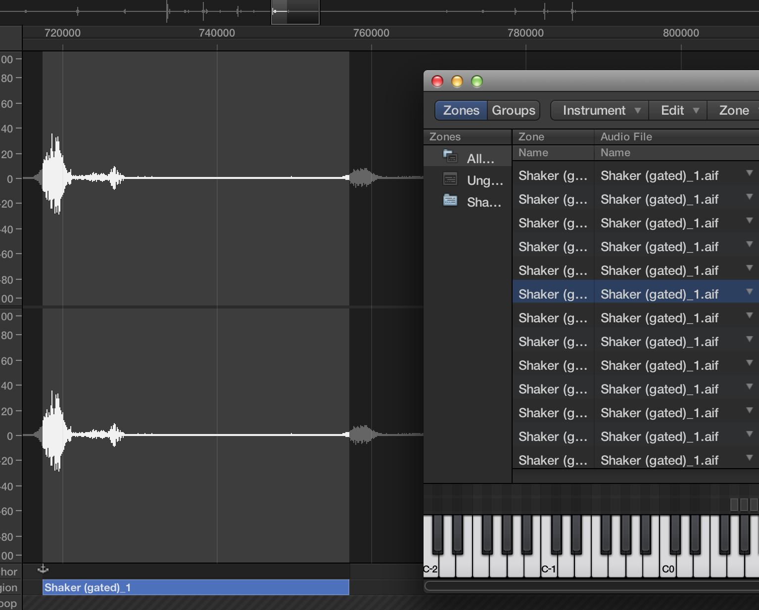 I ended up with a decent collection of shaker samples and created a few EXS24 sampler instruments that I used in the show. I was able to create some nice velocity layered patches with round robin samples to recreate the slight doppler effect from a real shaker. I wish the EXS24 editing UI was a bit easier to use, but it did manage to get the job done.