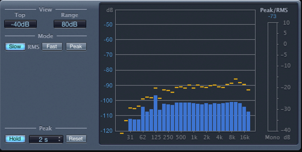 To get clean samples, you need a low noise floor and this is tricky when recording something subtle like a shaker. I used Logic Pro X and found the MultiMeter plug-in to be very helpful in measuring noise in the system. Just load a MultiMeter onto your track and adjust the “Top” and “Range” settings to focus in on your noise levels. Record some silence and then loop it to get a view of what you are dealing with: