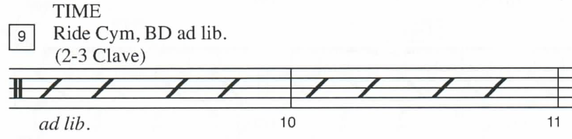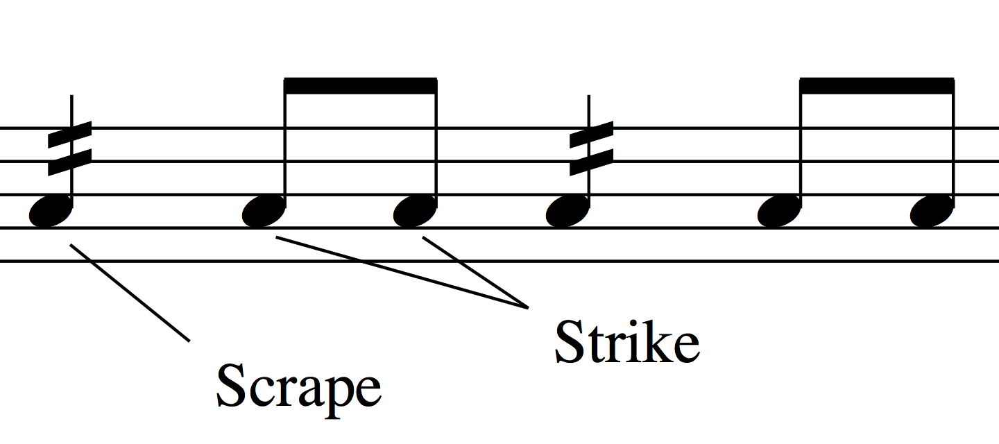 This fact became an issue for me while preparing for In The Heights. The score calls for various techniques on a Güira (a metal Guiro used in Dominican Meringue music), including the seemingly simple pattern below: