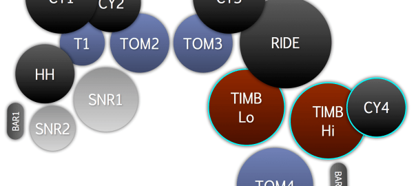 When I heard that I’d be playing alongside a percussion player for In The Heights, I had visions of a simplified drum setup with minimal program changes to worry about.  This was a short-lived dream, however, as the drum part has plenty of incidental percussion and various electronic and sampled sounds that needed to find a home on my kit.